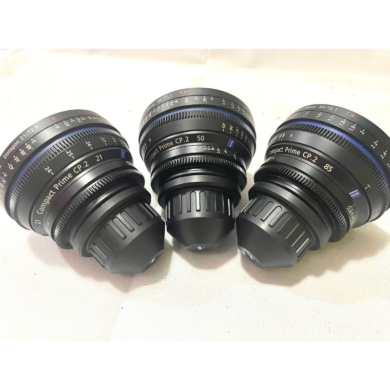 Incluye focales de 21mm T2.9, 50mm T2.1 y 85mm T2.1. Ópticas cinematográficas de alta calidad, ideales para producciones profesionales. Montura intercambiable, cobertura full frame y excelente rendimiento en color y nitidez.